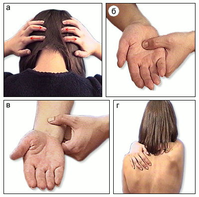 Массаж Шиацу при пониженном артериальном давлении: а) в области затылочных бугров; б) в центре ладони; в) на ладонной поверхности предплечья; г) в межлопаточной области слева.