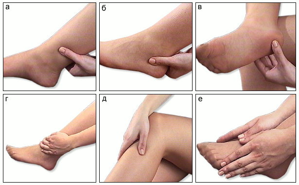 Массаж Шиацу при растяжении связок и болях в голеностопном суставе: а) выше области боли; б) ниже области боли; в) в области пятки; г) на линии сустава; д) ниже коленного сустава; е) поверхностный массаж голеностопного сустава.