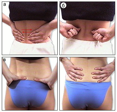 Массаж Шиацу при стойких болях в суставах: а) надавливание и растирание; б) статическое давление; в) давление с вращением; г) вибрация и поглаживание.