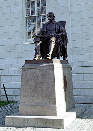 Массачусетс. Кембридж. Памятник Джону Гарварду. Скульптор Дэвид Френч. Памятник нельзя считать портретом, поскольку после смерти Гарварда не сохранилось ни одного его изображения. Существует примета: чтобы удачно сдать сессию, студент должен подержаться за ботинок правой ноги статуи.