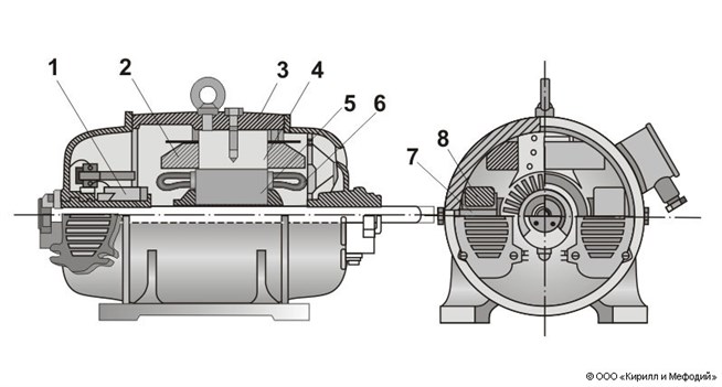 Машина постоянного тока: 1 — коллектор; 2 — обмотка возбуждения; 3 — станина; 4 — главные полюса; 5 — магнитопровод якоря; 6 — рабочая обмотка якоря; 7 — дополнительные полюса; 8 — обмотка дополнительных полюсов.