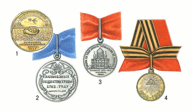 Медали Российской империи: 1 — «В память Ништадского мира», 1721; 2 — «За полезные обществу труды», 1762 (реверс — обратная сторона); 3 — «В память освящения храма Христа Спасителя», 1883; 4 — Георгиевская медаль «За храбрость», 1878.
