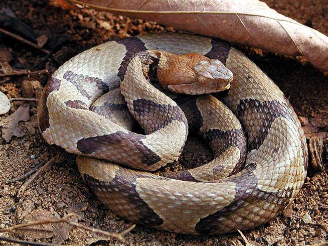 Медноголовый щитомордник (Agkistrodon contortrix).