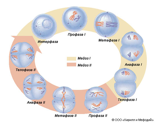 Мейоз — важная стадия образования половых клеток (гамет). Обычно они имеют вдвое меньше хромосом, чем другие клетки того же организма. Мейоз происходит в результате двух последовательных делений родоначальной диплоидной клетки. Каждое из них включает четыре фазы. Все фазы первого мейотического деления обозначают цифрой I, а все фазы второго деления — цифрой II. В результате мейоза I образуются две клетки, содержащие лишь по одной из двух гомологичных хромосом, каждая из которых состоит из двух хроматид. Затем наступает второе мейотическое деление (Мейоз II). В итоге из двух клеток мейоза I в телофазе мейоза II образуются четыре дочерние зрелые гаметы, каждая из которых несет гаплоидное число хромосом. Описанный процесс типичен для формирования мужских гамет. Образование женских половых клеток идет аналогично, но при овогенезе развивается лишь одна зрелая яйцеклетка, а три мелких редукционных тельца впоследствии отмирают.