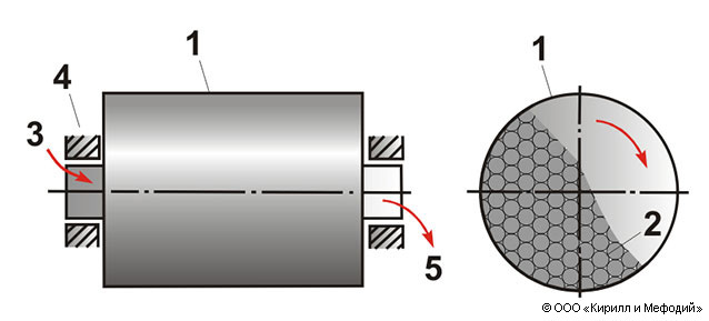 Барабанная мельница (шаровая): 1 — барабан; 2 — дробящие тела (шары); 3 — загрузка исходного материала; 4 — подшипники; 5 — разгрузка измельченного материала.