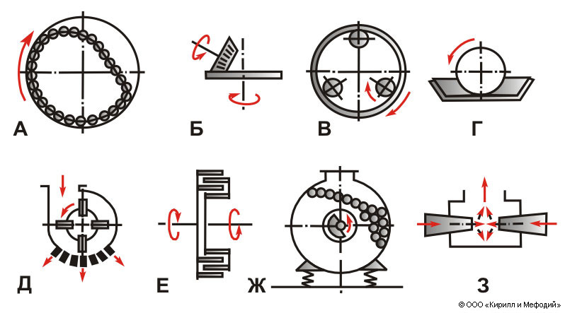 Схемы мельниц: а — барабанной; б — роликовой; в — кольцевой; г — бегуны; д — молотковой; е — пальцевой (дезинтегратор); ж — вибрационной; з — струйной.