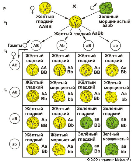 В своих опытах с наследственностью на примере гороха Мендель изучал не только численные закономерности комбинирования при скрещивании форм, отличавшихся по одному признаку, но и экспериментировал с двумя и более парами признаков. В результате был открыт закон независимого комбинирования признаков (независимого расщепления). На схеме — свободное комбинирование двух пар признаков (окраска и форма семян у гороха) с расщеплением 9 : 3 : 3 : 1; А — желтая окраска семян (доминантная), а — зеленая окраска семян (рецессивная); В — гладкая форма семян (доминантная); b — морщинистая форма семян (рецессивная); Р — родительские формы; F — гибриды первого поколения; F2 — гибриды второго поколения.