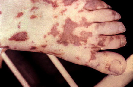 Менингококкемия: геморрагическая сыпь с некрозами.