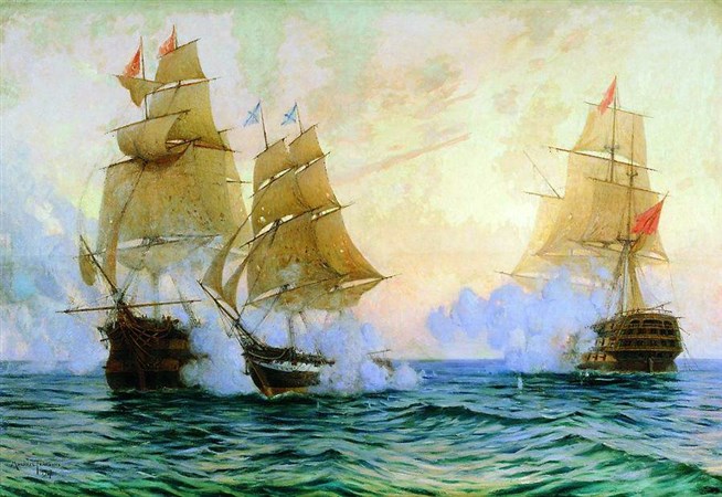 Михаил Степанович Ткаченко (1860-1916). Бой брига «Меркурий» с турецкими кораблями 14 мая 1829 года. 1907 год. Холст, масло. Центральный военно-морской музей, Петербург.
