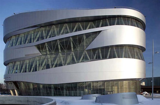 Новое здание музея «Мерседес-Бенц», открытое в мае 2006 в Штутгарте (Германия). Музей рассказывает об истории образования концерна и сотрудничестве изобретателя бензинового двигателя Даймлера и первого конструктора автомобилей Бенца.