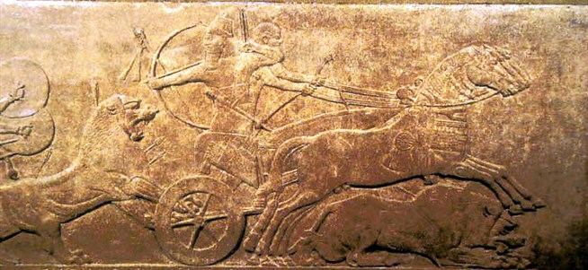 Охота на льва. Месопотамия. Музей, Лондон. Великолепные настенные рельефы в дворцовых комплексах ассирийских царей — своего рода хроника их правления, часто сопровождаемая пояснительными надписями. Наиболее часто встречающиеся сюжеты настенных рельефов — грандиозные военные сражения, сцены царской охоты и придворной жизни, религиозные обряды.
