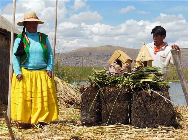 Местные жители на плавучем плоту, их поделки. Озеро Титикака. Перу. 2012 год. Фото: Ксения Голубь