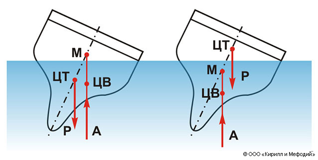 Положение метацентра М при устойчивом (слева) и неустойчивом (справа) равновесии плавающего тела. ЦТ — центр тяжести; ЦВ — центр водоизмещения; Р — сила тяжести; А — выталкивающая сила.