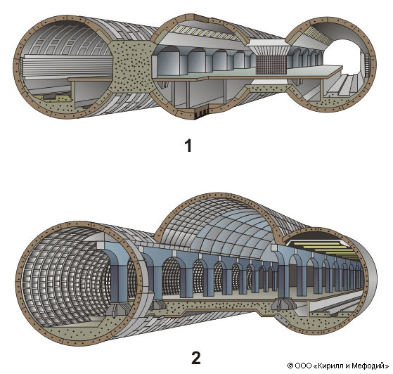 1 — станция метрополитена пилонного типа с обделкой из железобетонных тюбингов. 2 — станция метрополитена колонного типа с увеличенным пролетом среднего зала.
