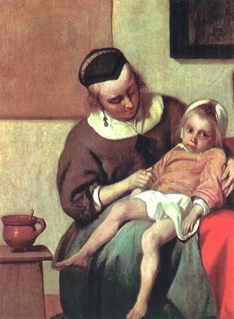 Габриель Метсю. Больное дитя. Около 1660 года. Холст, масло. Риксмузеум, Амстердам.