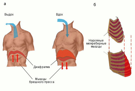 Механизм дыхательных движений (изменение объема грудной клетки) за счет диафрагмы и мышц брюшного пресса (а) и сокращения наружных межреберных мышц (б).