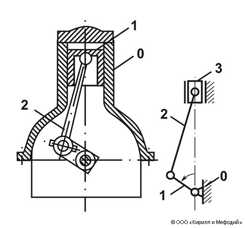 Чертеж (а) и кинематическая схема (б) механизма двигателя внутреннего сгорания; 1 — коленчатый вал (кривошип); 2 — шатун; 3 — ползун; О — стойка.