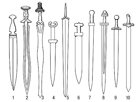 Мечи: 1-2 — древнейшие типы бронзовых мечей; 3 — древнейший тип европейских железных мечей (гальштатская культура); 4 — скифский меч акинак; 5 — меч латенской культуры (5-1 вв. до н.э.); 6 — римский меч гладиус; 7 — длинный римский меч спата; 8-9 — древнерусские мечи; 10 — кавалерийский меч Ближнего Востока.
