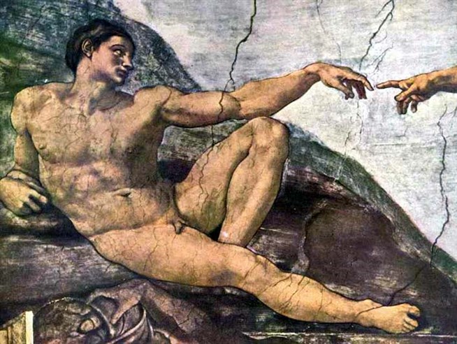 Микеланджело Буонарроти. Адам. Фрагмент росписи потолка Сикстинской капеллы. 1508-1512 годы. Фреска. Ватикан.