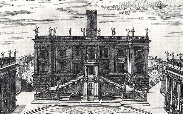 Площадь римского Капитолия по проекту Микеланджело. Палаццо Сенаторов. Гравюра Э. Дюперака. Деталь. 1569.