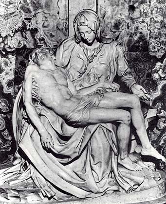 Микеланджело. «Пьета». 1498-1499. Собор святого Петра. Рим. «Пьета» (сцена оплакивания Христа богоматерью) является одним из ранних произведений Микеланджело, но оно свидетельствует о творческой зрелости мастера.