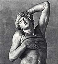 Микеланджело. «Умирающий раб». Около 1513. Лувр. Статуя «Умирающего раба» с перевязью на груди вместо оков полна трагизма. Кажется, еще несколько мгновений и фигура, у ног которой изображена обезьяна, символизирующая зло, бессильно сползет вниз и сердце раба перестанет биться. Статуя была задумана и трактована по контрасту с «Восставшим рабом».