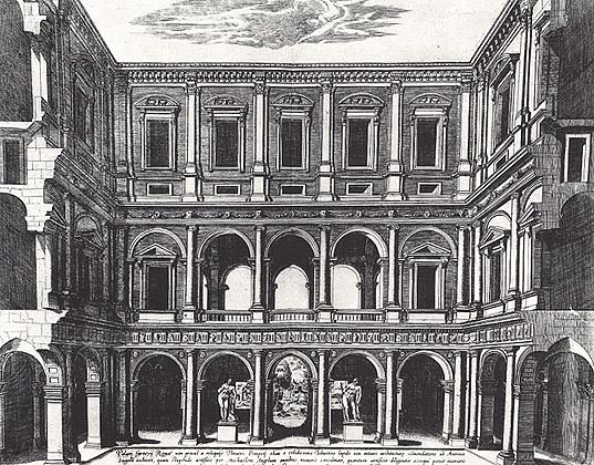 Двор палаццо Фарнезе по проекту Микеланджело. Гравюра А. Лафрери. 1560.