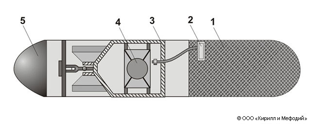 Авиационная неконтактная донная мина: 1 — заряд взрывчатого вещества; 2 — электродетонатор; 3 — приборная камера; 4 — магнитный взрыватель, подвешенный на амортизаторах; 5 — парашютное отделение.