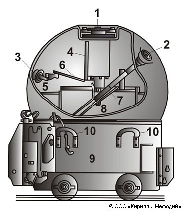 Устройство ударно-механической мины: 1 — горловина для ударного прибора; 2 — горловина для запального стакана; 3 — горловина для прибора потопления; 4 — ударно-механический прибор; 5 — прибор потопления (если мина всплывает); 6 — молоток прибора потопления; 7 — запальный стакан; 8 — зарядная камера; 9 — якорь; 10 — подъемные скобы якоря.