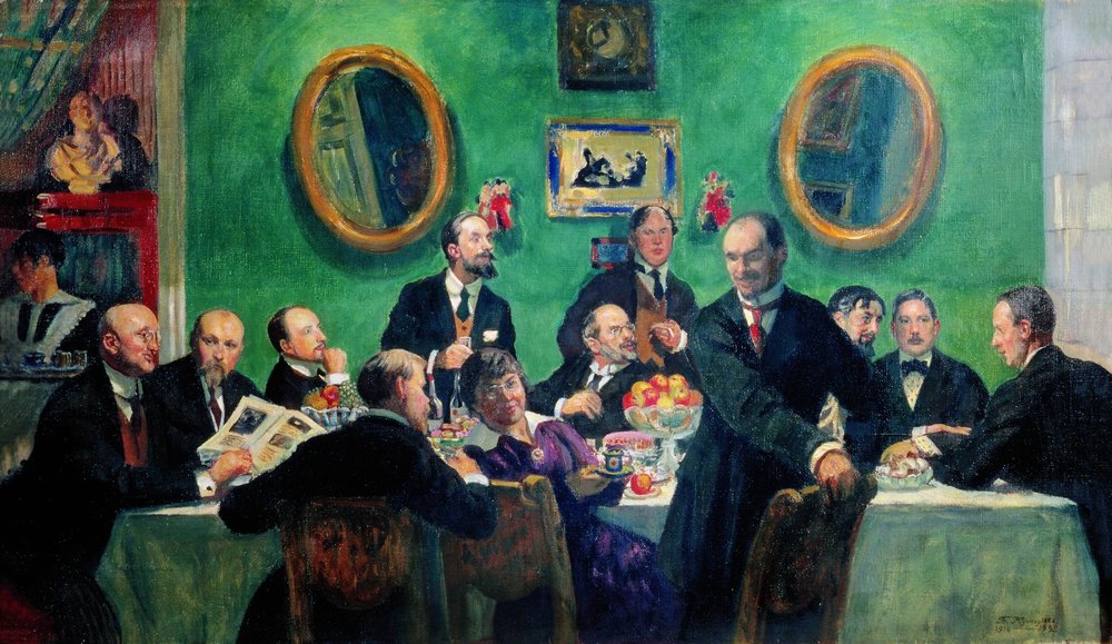 Б.М. Кустодиев. Групповой портрет художников общества «Мир искусства». 1916-1920 годы. Эскиз. Слева направо И. Грабарь, Н. Рерих, Е. Лансере, Б. Кустодиев, И. Билибин, А. Остроумова-Лебедева, А. Бенуа, Г. Нарбут, К. Петров-Водкин, Н. Милиоти, К. Сомов, М. Добужинский. Холст, масло. Русский музей, Петербург.
