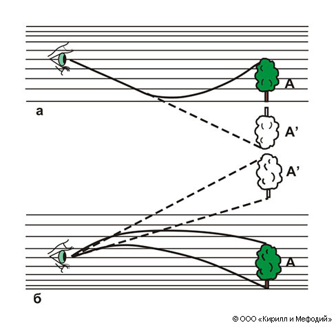 Схема возникновения миража: а — нижнего; б — верхнего.