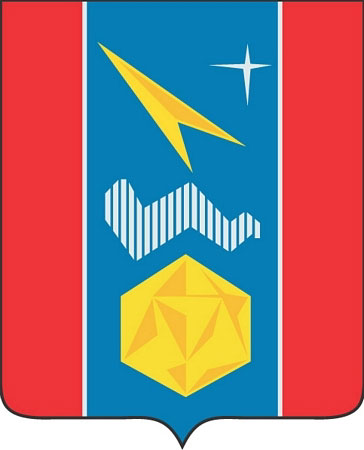 Герб города Мирный был принят 27 апреля 2005 года. В лазоревом поле золотой ограненный камень, вертикальные серебряные лучи (северное сияние), золотой наконечник стрелы, серебряная четырехконечная звезда.