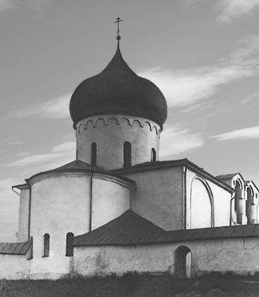 Спасо-Преображенский собор был построен в 1156 по повелению новгородского и псковского владыки Нифонта близ Пскова, при впадении речки Мирожи в Великую. Собор — крестчатый, трехапсидный, одноглавый, с пониженными западными углами и боковыми апсидами — предельно лаконичен. Сложен из плитняка и плинфы. Восходит к восточно-византийской традиции. Сохранилась роспись храма, выполненная в третьей четверти 12 в. Она отличается от новгородской почти предельной линейностью. Наиболее примечательная по силе и драматизму композиция («Положение во гроб») расположена на северной стене храма.