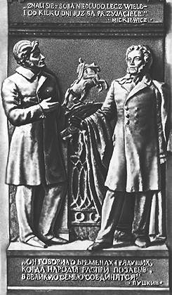 А. Мицкевич и А. С. Пушкин. Горельеф И. Мильбергера. Установлен на доме в Москве в Глинищевском переулке, где встречались поэты.