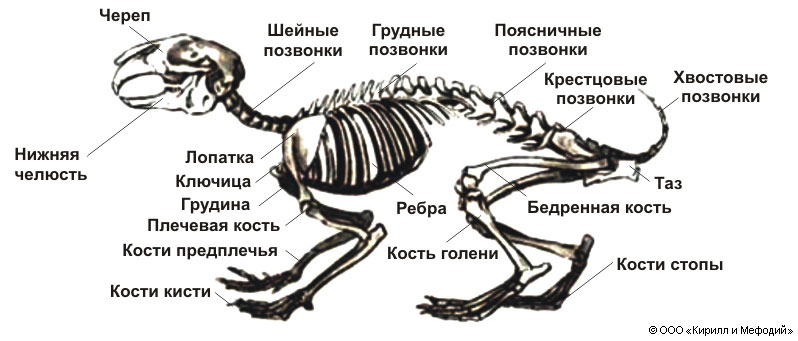 Позвоночник млекопитающих состоит из шейных, грудных, поясничных, крестцовых и хвостовых позвонков. Соединенные с грудиной ребра образуют грудную клетку.