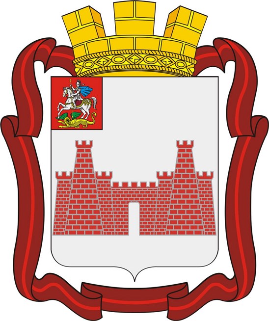 Описание: В серебряном поле четыре башни, соединенные зубчатой стеной со сквозной аркой посередине; из-за стены по краям выходят две башни; стена и башни червленые, мурованные серебром. В вольной части — герб Московской области.