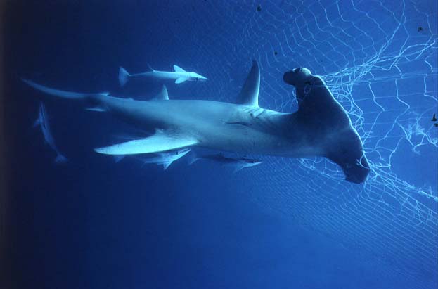Акула-молот, запутавшаяся в рыболовных сетях.