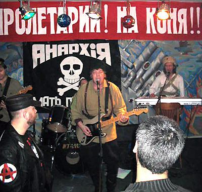 Музыканты группы «Монгол Шаудан» разделяют идеологию анархизма, что отражается в их репертуаре и манере исполнения. Концерт в развлекательном центре «Нева» 27 декабря 2003 года.