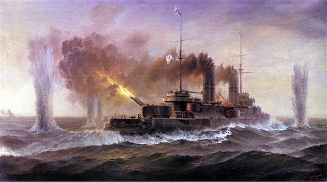 Г. В. Горшков. «Бой линейного корабля «Слава» с немецкими кораблями в Моозундском проливе. 17 октября 1917 года». 1947.