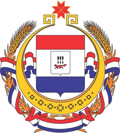 Герб Республики Мордовия был принят 30 марта 1995 года. В центре герба геральдический щит маренового (темно-красного), белого, темно-синего цветов с гербом Саранска в середине, обрамленного золотыми колосьями пшеницы, перевитыми лентой национальных цветов; нашейной золотой гривной (женское украшение) с семью орнаментальными узорами по числу городув Мордовии. Вверху герба солярный знак — восьмиконечная розетка красного цвета.