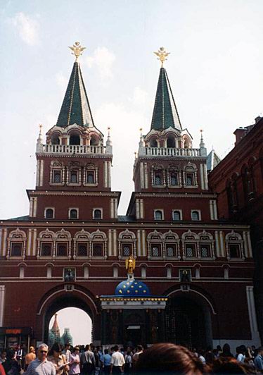 Москва. Воскресенские (Иверские) ворота. 1534, воссозданы в 1995. Ведут на Красную площадь со стороны моста через реку Неглинную, свое название получили по находившейся здесь часовне чудотворной Иверской иконы Божией Матери.
