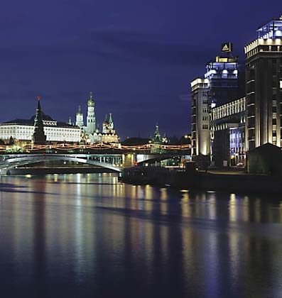 Вид на Московский Кремль с набережной Москвы-реки (фотография 2000 г.). За Большим Каменным мостом возвышается Водовзводная башня и колокольня «Иван Великий», слева виден Большой Кремлевский дворец, справа — Театр эстрады.