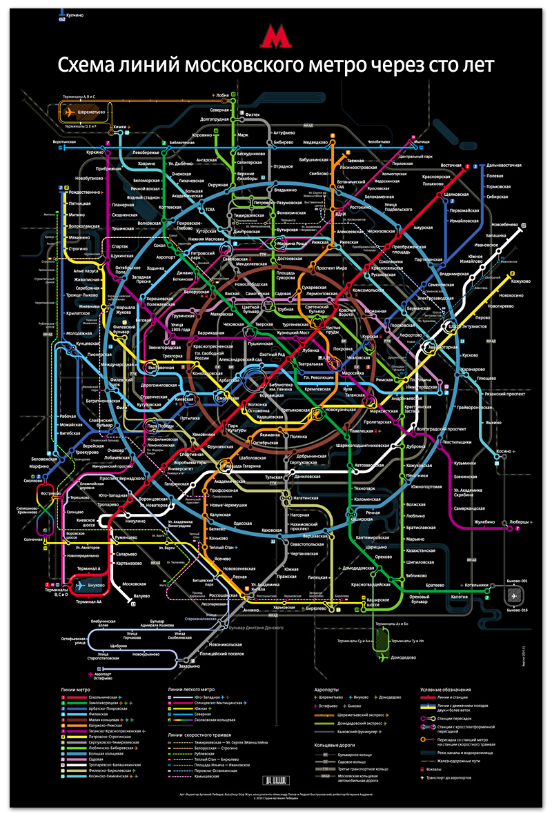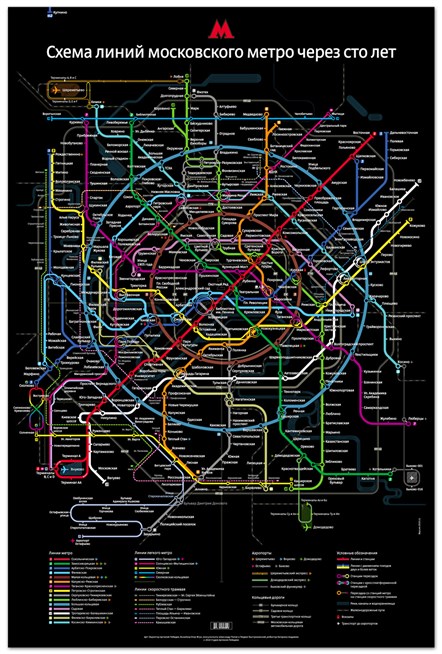 Схема линий московского метро через сто лет. Дизайнерский проект, выполненный студией Артемия Лебедева: «К спроектированной ранее схеме метро мы дорисовали еще девять новых веток, увеличив почти в три раза количество станций, но сохранив при этом основной костяк. В результате получился безумный и красивый черный плакат. Какие-то станции, ветки и пересадки были нарисованы в соответствии с генпланом, где-то пришлось включить фантазию. Рады сообщить, что к 2100 году со станции «Арбатская» ФЛ наконец пропадут туристы, не понимающие, как им с этой станции перейти на «Библиотеку имени Ленина». Теперь оттуда до «Александровского сада» можно будет либо дойти по переходу, либо доехать на метро». 2010 год. metro.ru