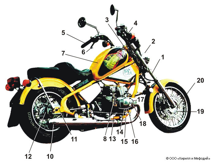 Схема устройства мотоцикла: 1 — передняя вилка; 2 — центральный переключатель (замок зажигания); 3 — спидометр; 4 — рычаг привода переднего тормоза; 5 — рукоятка управления карбюратором; 6 — рычаг выключения сцепления; 7 — топливный бак; 8 — карбюратор; 9 — амортизатор задней вилки; 10 — глушитель; 11 — задняя вилка; 12 — цепь задней передачи; 13 — педаль переключения передач; 14 — сцепление; 15 — цепь передней передачи; 16 — коленчатый вал; 17 — поршень; 18 — цилиндр; 19 — тормозная колодка; 20 — ступица.