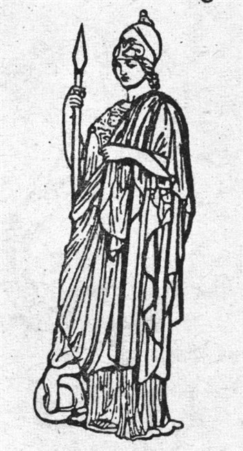 Древнегреческая богиня мудрости Афина (в римской мифологии Минерва) со свернувшейся змеей в ногах