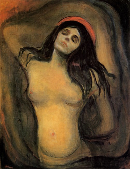 Эдвард Мунк. Мадонна. 1893-1894 годы. Холст, масло. Всего было создано пять оригиналов картины, три их них хранятся в музее Мунка и Национальном музее искусства, архитектуры и дизайна в Осло, в Кунстхалле в Гамбурге, два — у частных коллекционеров. Моделью для картины была Дагни Юль, жена писателя Станислава Пшибышевского и близкая подруга Мунка.