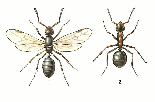 Рыжий лесной муравей: 1 — крылатая самка; 2 — «рабочий».
