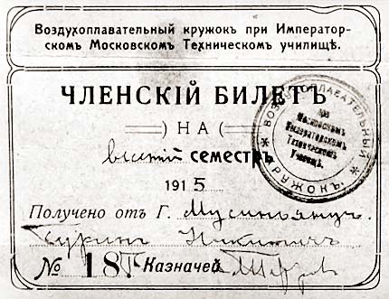Членский билет Воздухоплавательного кружка при Московском техническом училище (ныне Технический университет им. Н. Э. Баумана).