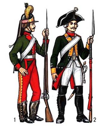 Мушкетеры (Россия): 1 — рядовой Мушкетерского полка, 1786-96; 2 — рядовой Белозерского мушкетерского полка, 1797-1801.