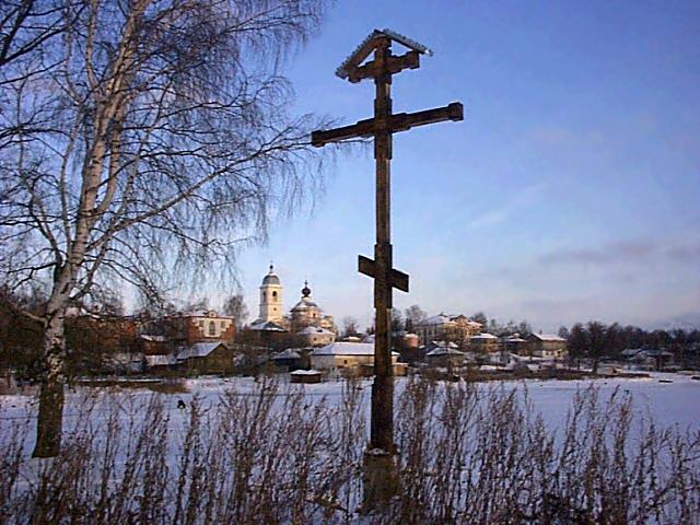 Мышкин. Памятный крест в месте основания города. На заднем плане Успенский собор.